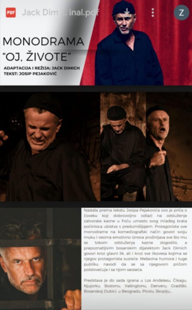 Глумац Џек (Жељко) Димић одиграо је вечерас пред вишеградском публиком монодраму „Ој животе“. Настала према тексту Јосипа Пејаковића, представа „Ој, животе“ доноси потресну причу о човјеку који добровољно одлази на одслужење затворске казне умјесто свог млађег брата, починиоца убиства с предумишљајем. Протагониста на комедиографски начин говори о својој муци, док кроз емотивне сцене оживљава све […]